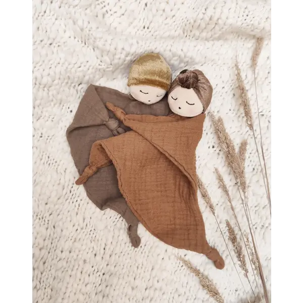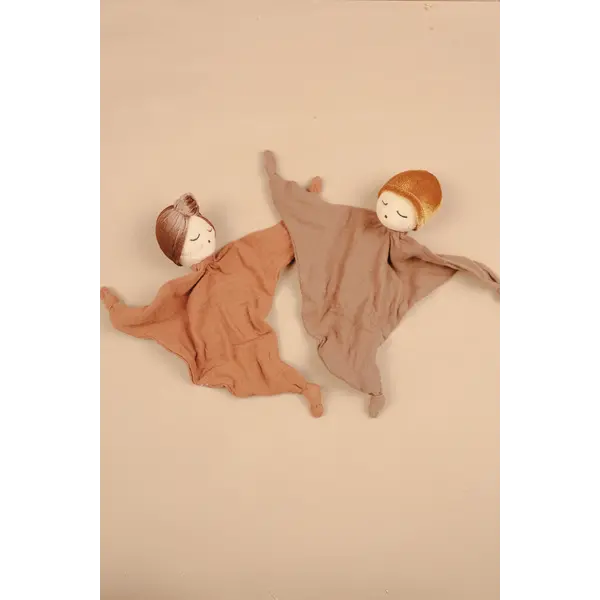 Onze Sleepy Friends zijn handgemaakt van biologisch katoen. Ze kunnen fungeren als fopspeenhouder en zijn een stuk dat zeker deel zal uitmaken van de dutjes en dromen van de jongsten.